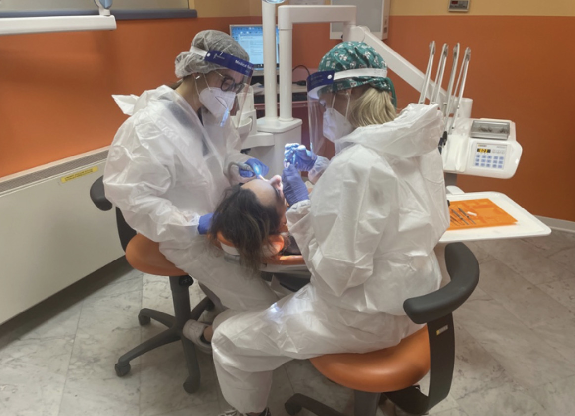 Per quanto riguarda le manovre di igiene orale pur essendo tra le procedure più a rischio nella pratica odontoiatrica durante la pandemia, è altresì vero che, per la tutela della salute del paziente, sono poco procrastinabili per la prevenzione e la cura delle patologie orali più frequenti (Ministero della Salute, 2017) (2)e patologie che possono portare a danno sistemico per l’organismo (3). In questo ultimo anno sono stati pubblicati numerosi lavori riguardo all’importanza di un buon livello di igiene orale che influenza inevitabilmente la salute sistemica e viceversa. Per quanto riguarda i DPI, viene confermato l’utilizzo delle mascherine FP2 o FP3 durante le procedure operative, ma “il dispositivo (tuta/camice) deve essere sostituito al termine di ogni procedura che genera aerosol e non più al termine di ogni singola prestazione odontoiatrica.