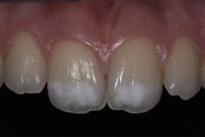 Le foto a T-0 mettono in evidenza come l’inestetismo presente in sede 11 e 21 risulti particolarmente fastidioso per la paziente (immagine 1-2). Le immagini al follow-up a 6 e 12 mesi (immagini 4-5) mostrano il risultato soddisfacente del trattamento remineralizzante con un miglioramento della lesione dello smalto che ad oggi si presenta con un’area meno estesa e una riduzione dell’opacità generale delle lesione con un aumento della traslucenza.