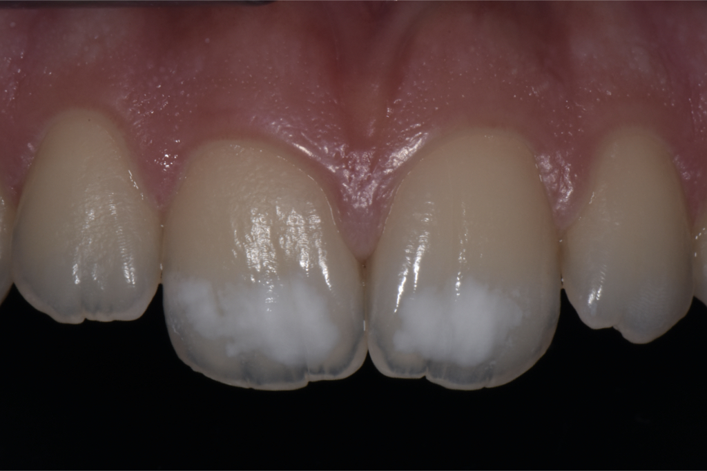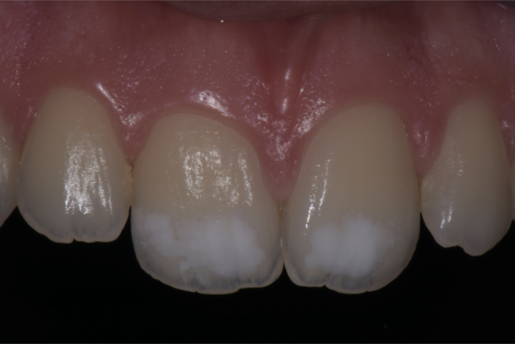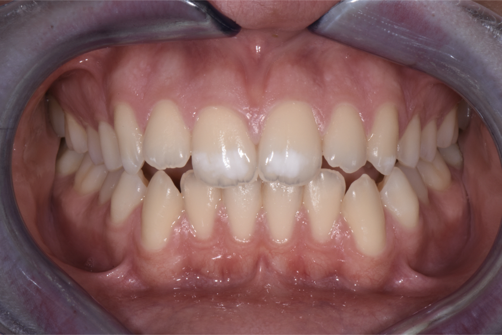 In passato non è stato fatto né proposto alcun tipo di trattamento con dentifrici o mousse specifici. L’unica proposta terapeutica è stata quella di attendere la maggiore età per risolvere l’inestetismo con due faccette in ceramica in sede 11 e 21 (soluzione che al momento non soddisfa né la paziente né i genitori per l’invasività del trattamento). A seguito di una corretta anamnesi e attenta valutazione clinica, spieghiamo alla paziente che si tratta di una ipomineralizzazione dello smalto da trauma e che al momento possiamo approcciare solo con l’utilizzo di prodotti reminaralizzanti e che al raggiungimento della maggiore età potremmo provare con una tecnica combinata (sbiancamento professionale e infiltrazione) a migliorare l’inestetismo presente.