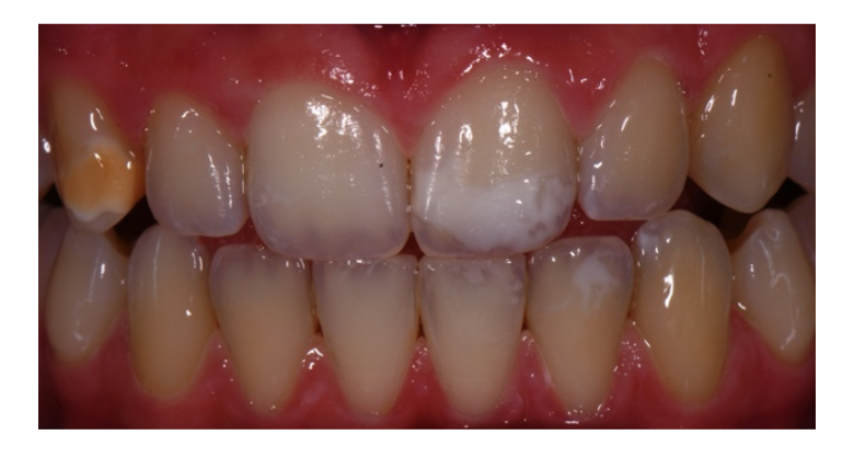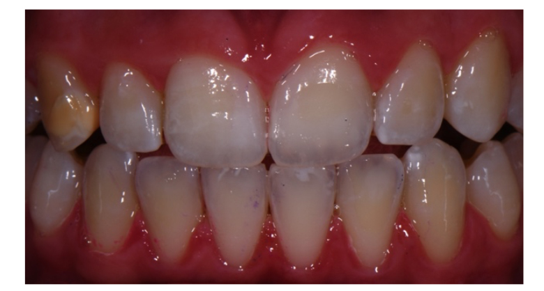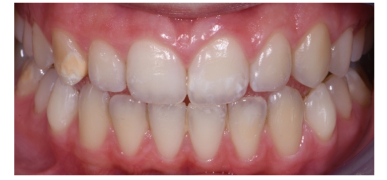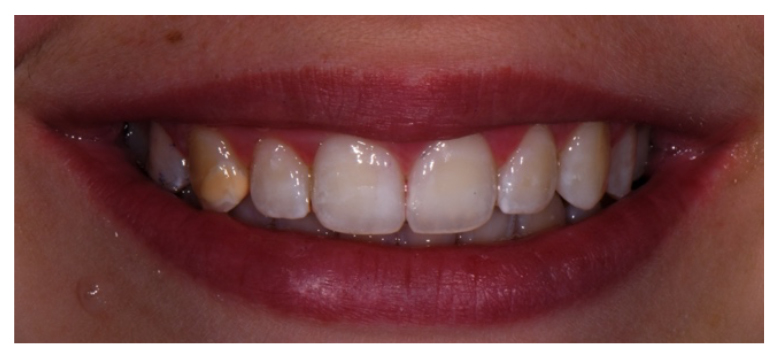 Dopo la conclusione del trattamento ortodontico fisso, la paziente ha iniziato ad utilizzare dentifrici sbiancanti con l’obiettivo di riuscire a mimetizzare le lesioni dello smalto.