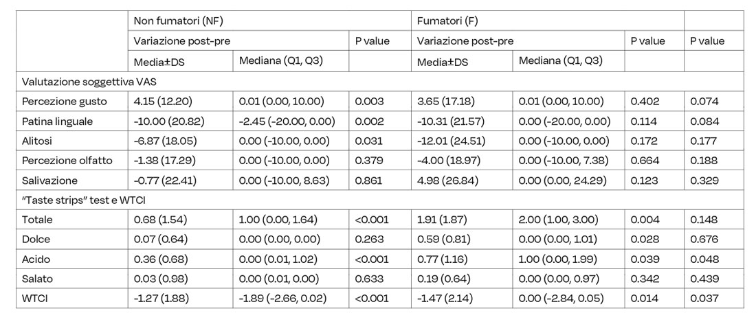 FUMATORI: assenza variazioni nel questionario, diminuzione WTCI, valutazione soggettiva del gusto e gusti acido e dolce significativamente migliorati.