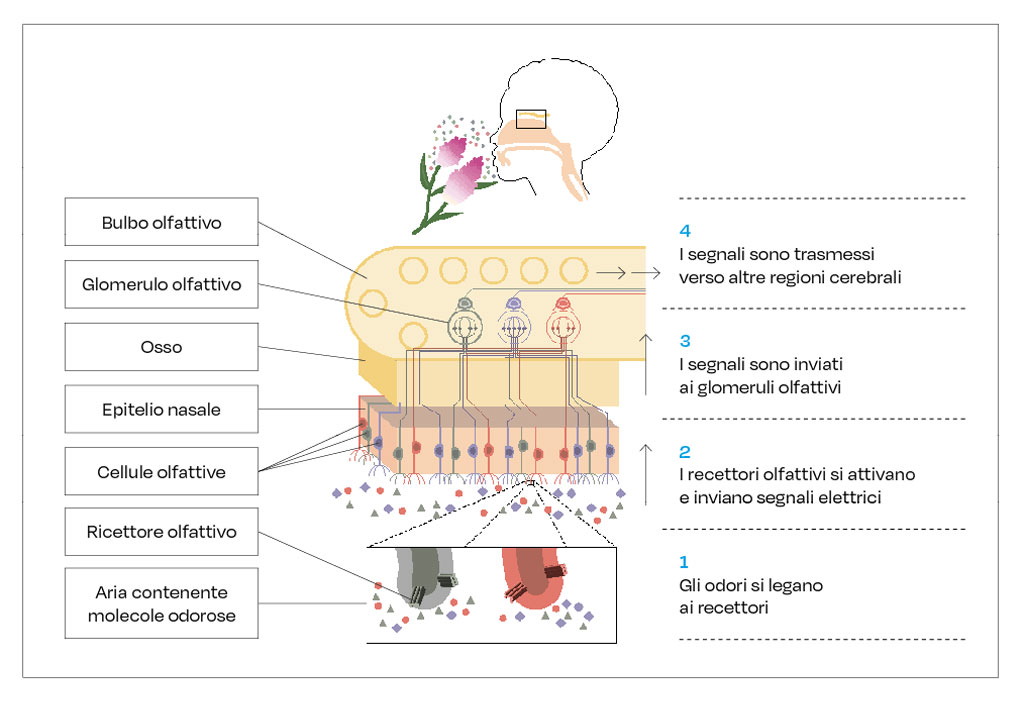 Quando respiriamo, le molecole odorose presenti nell’aria entrano nel naso attraverso le narici e vengono catturate dalla mucosa olfattiva, una zona specifica situata nella parte superiore della cavità nasale; la mucosa olfattiva è ricoperta da un sottile strato di muco che aiuta a dissolvere le molecole odorose.
