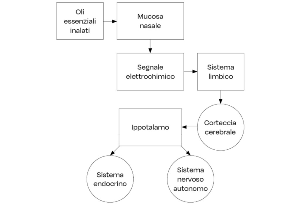 Quando il profumo di un OE viene inalato (Figura 2), gli stimoli elettrochimici possono venire interpretati come messaggi rilassanti, euforizzanti, sedativi o stimolanti; può essere incentivata la produzione di noradrenalina e di serotonina, mediatori chimici di reazioni emozionali rispettivamente di tipo stimolante e rilassante.