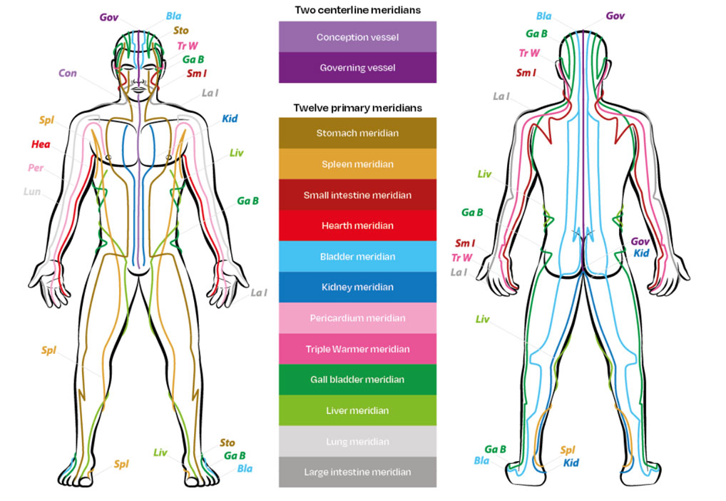Premessa: secondo le teorie della MTC, la funzione degli organi dipende dai canali attraverso i quali scorre l’energia vitale (Qi) noti come “meridiani”; i meridiani (Figura 3) collegano l’interno con l’esterno, trasmettendo il Qi e il sangue ai vari organi e consentendo al corpo di funzionare come un insieme armonioso.